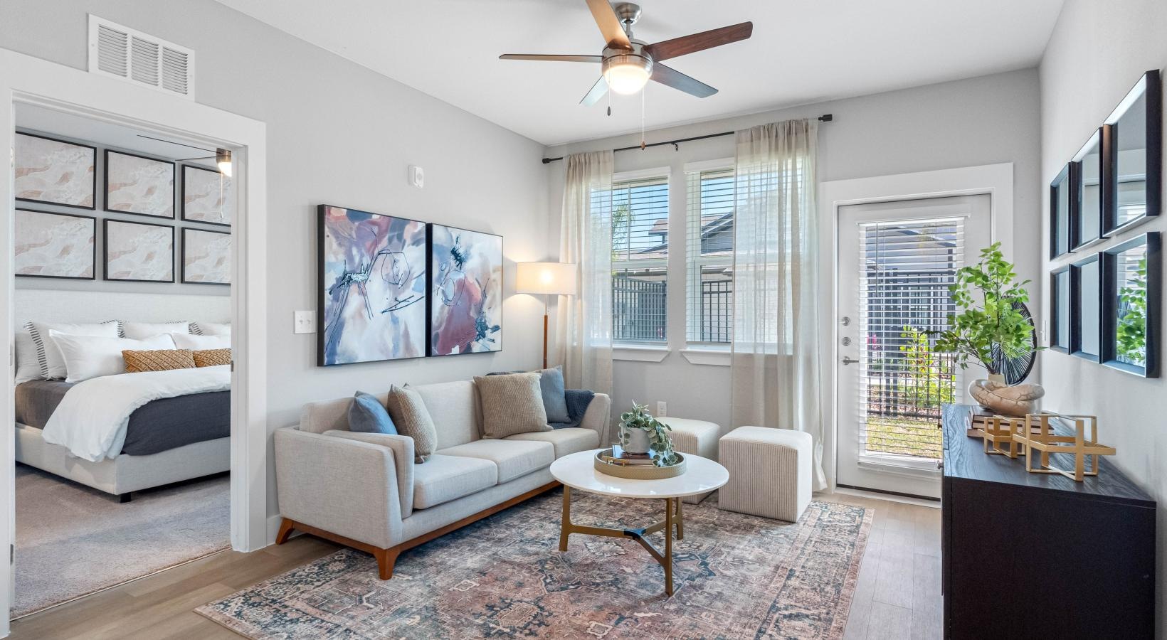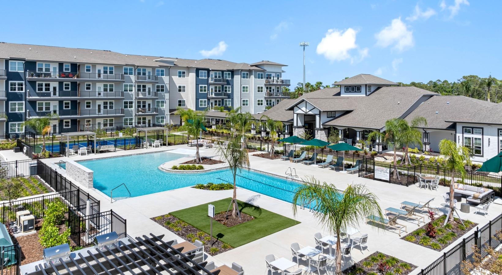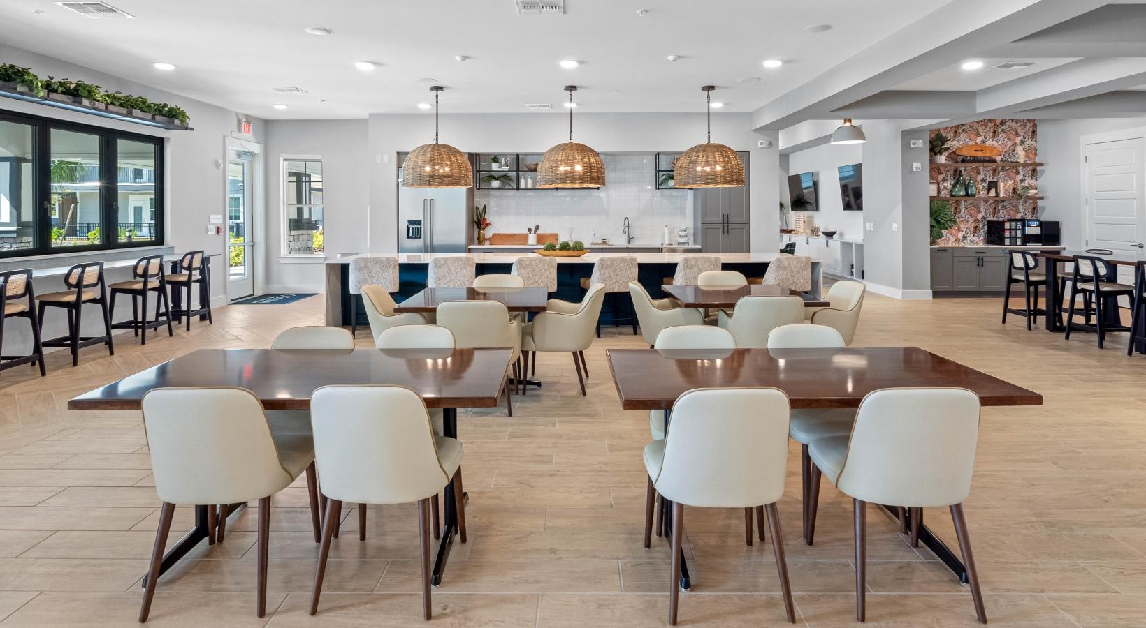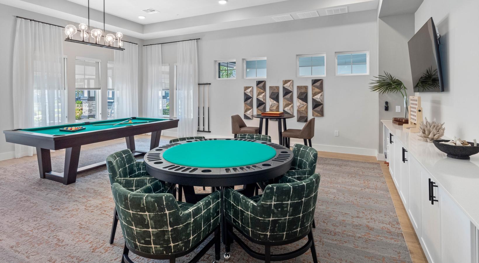 living room with fan couch and coffee table a pool in a courtyard at dusk kitchen with large island and seating  view from a balcony of a pickleball court and a pool in a courtyard